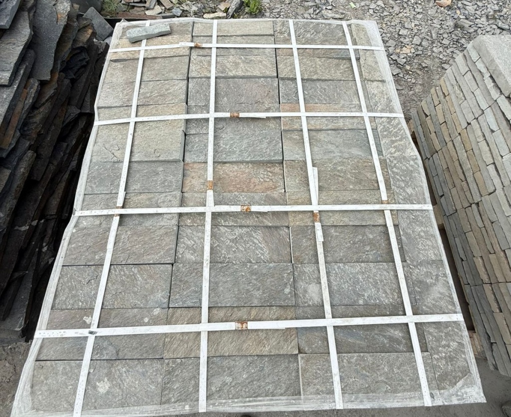 - необработанные плитки толщиной - 1,5-3 см. - по 30м2 на 1 поддоне - применяется в для облицовки вертикальных поверхностей, плитки от 2 до 3 см., благодаря цельной структуре и прочности камня, также можно применять для мощения дорожек, но только на бетонное основание.